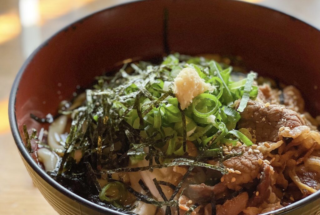 牛肉たっぷりの濃厚な出し汁で、当店一押しうどん